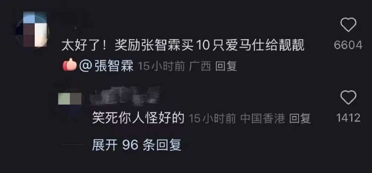 还有网友留言:“奖励张智霖买10只爱马仕给靓靓!”