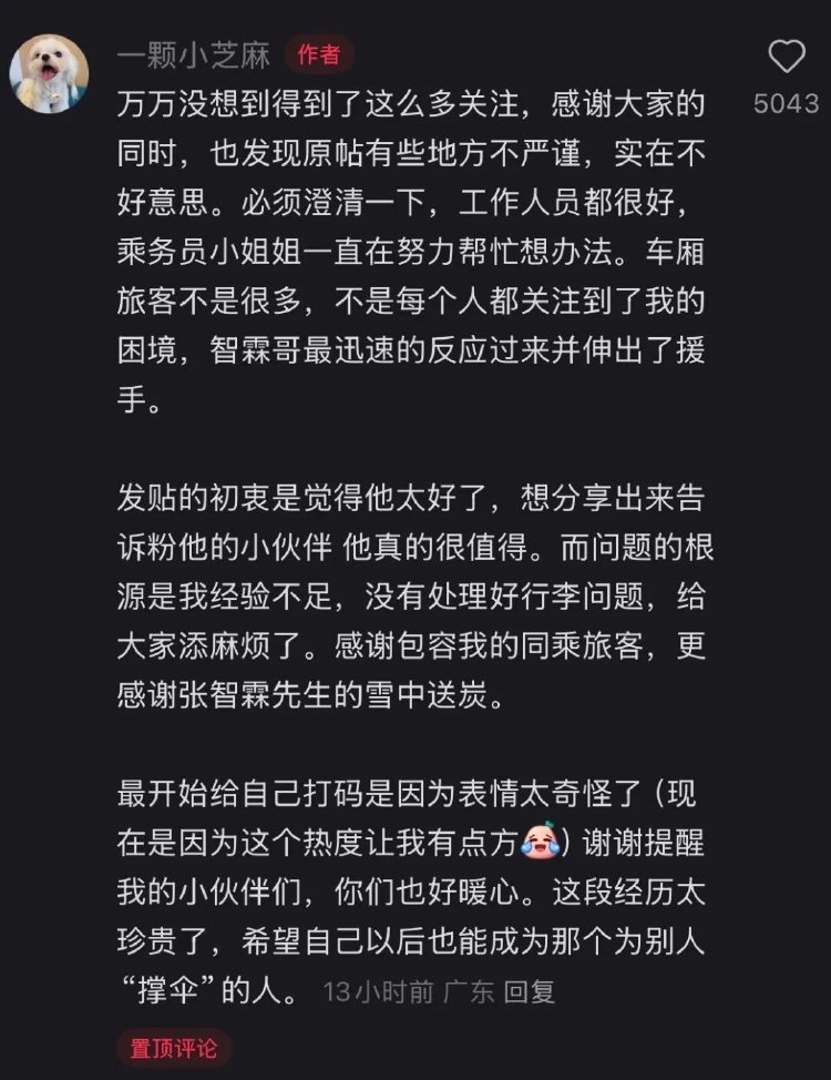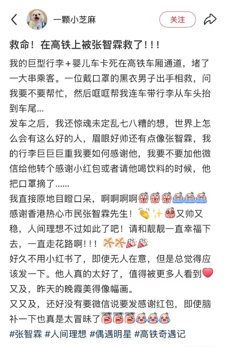 发车之后,这位网友想要感谢帮助自己的人,“行李巨重……我想要不要给他转个感谢小红包或者请他喝饮料的时候,他把口罩摘了……”网友发现,他竟然是张智霖!