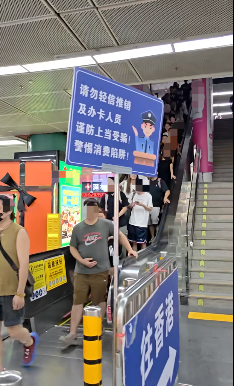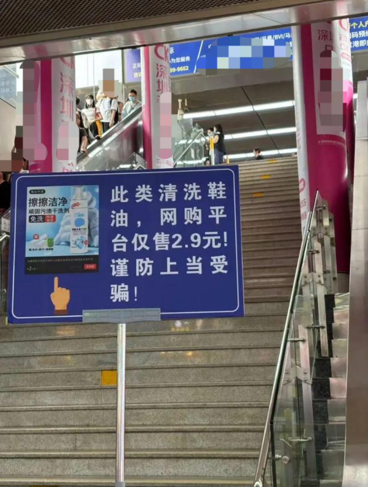 近日有网友发帖称,在深圳罗湖口岸与商业街衔接的自动扶梯处,看到多块蓝底白字的“防骗”警示牌,明确提醒过往行人“此类清洗鞋油,网购平台仅售2.9元!谨防上当受骗!”以及“请勿轻信推销鞋油及办卡人员,谨防上当受骗!警惕消费陷阱!”视频发布后迅速在社交平台引发热议,不少网友直呼:“这种老掉牙的推销手法,没想到现在仍有人中招。”