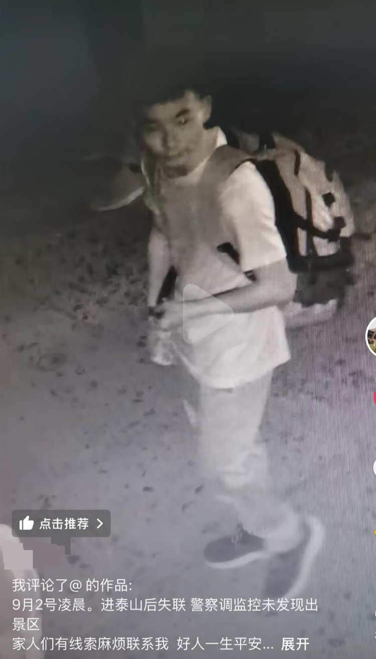 失联当天,李小龙身穿白色短袖,背着双肩包。王女士向记者提供了两张监控图片,她了解到,一张是9月2日凌晨李小龙进入泰山景区上山的监控图片,另一张疑似是2日上午7时40分许李小龙下山的画面,这是他最后一次出现在监控中,但这条路山下出口没有李小龙的记录,也没有监控信息。王女士推测:“上山还好,可能下山没有走正常的路。”她介绍,这条路出口处是一个铁门,有人24小时值守,要求出来的人在本子上登记信息。“我们守了几天,那条路下来的人登记留下的电话号码,我们一个个联系,都对小龙没有印象。”王女士说。