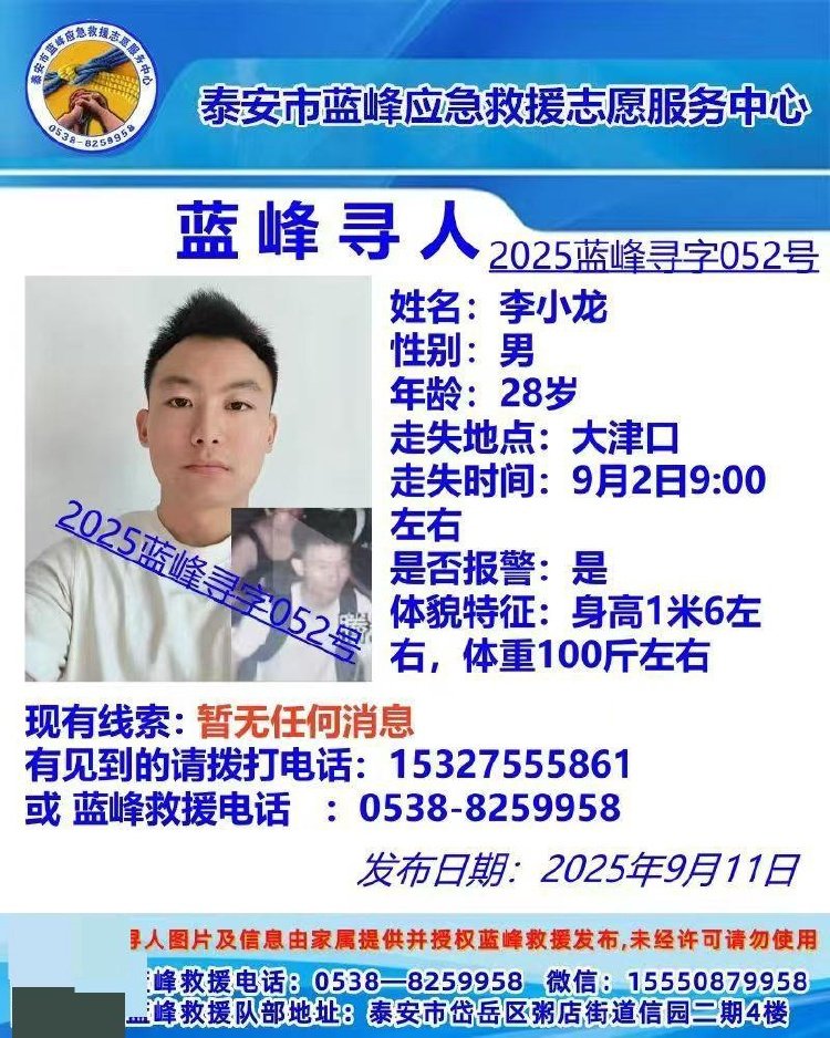 泰安一支民间救援队9月11日发布的寻人启事显示,李小龙身高1.6米左右,体重50公斤左右,9月2日9时左右在大津口走失。12日上午该救援队一名工作人员告诉记者,11日接到李小龙亲属的求助,制作发布了该寻人启事,目前没有接到线索。工作人员表示,在队员群里发了通知,“组织到(救援的)人以后,会和亲属联系。”这名工作人员还推测:“他有可能走小道,没有监控,手机应该也没电,(救援)很复杂。”