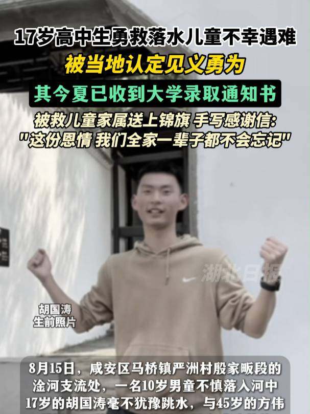 8月15日,即将年满18岁的胡国涛在咸宁为解救落水男童,将生命永远定格在舍己救人的英勇瞬间。