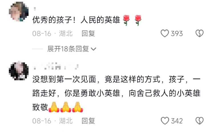 “勇者无畏,善者无私”“优秀的孩子!人民的英雄!”“孩子,一路走好。”视频下,数百条网友评论致敬缅怀。