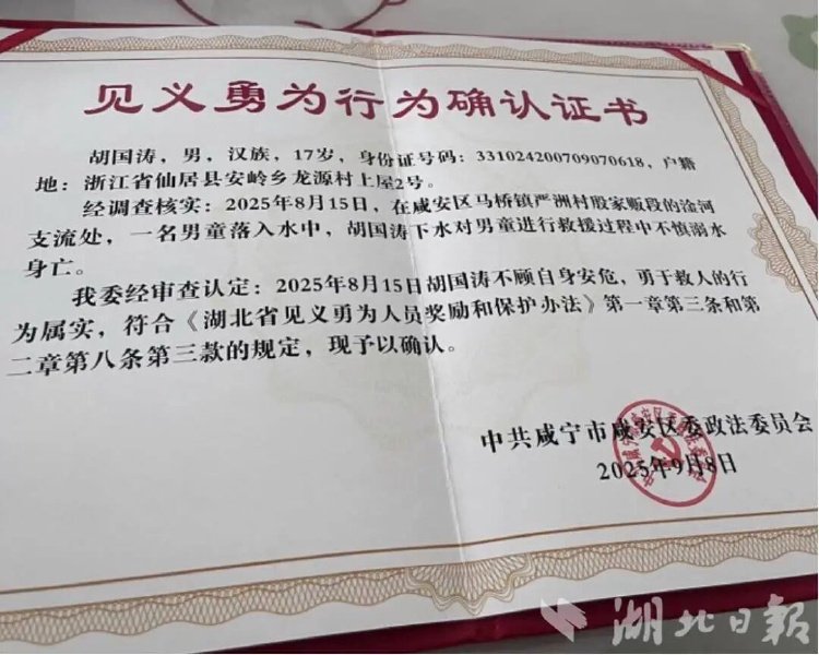 湖北日报消息,9月8日,咸宁市咸安区委政法委召开见义勇为通报表扬会,将见义勇为行为确认证书郑重交到胡国涛家属手中,对胡国涛舍己救人的英勇事迹予以高度肯定,向其亲属表示崇高敬意。