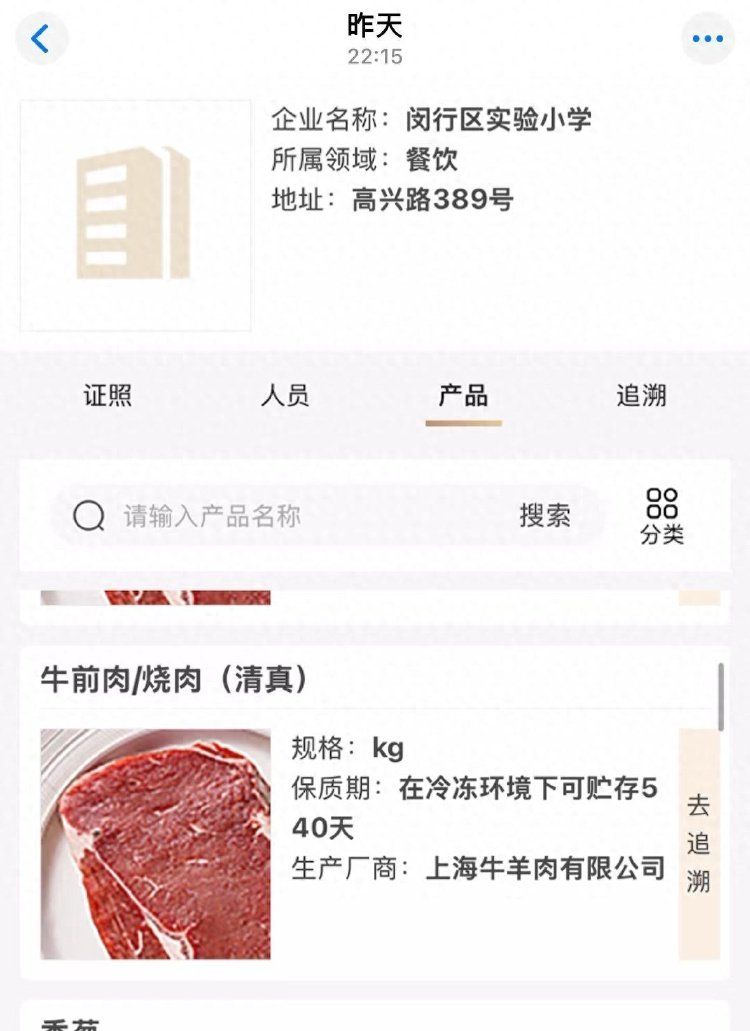 当晚,记者通过上海市食品安全信息追溯平台进行了搜索。以闵行区实验小学进购的一款“牛前肉/牛后肉”为例,该肉品的生产厂商为上海牛羊肉有限公司,保质期为在冷冻环境下可贮存540天。溯源详情信息显示,该产品由上海牛羊肉有限公司、上海绿捷公司流通,最终出货至闵行区实验小学。