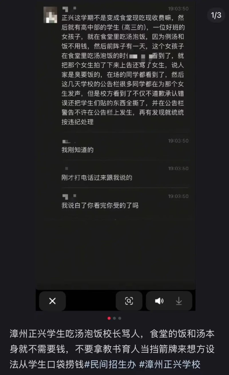 潇湘晨报消息,近日,有多名网友发帖称,在福建漳州正兴学校,一高三女生在食堂吃免费的汤泡饭被一校领导看到后,女生被校领导拍下并辱骂“臭要饭的”。