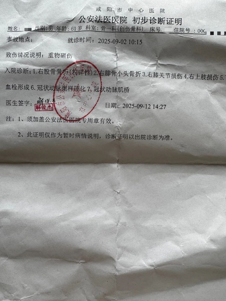 当天,医院出具的初步诊断证明显示,李女士父亲为右股骨粉碎性骨折、右腓骨小头骨折,同时右膝关节与右上肢损伤,还伴有血栓的形成。
