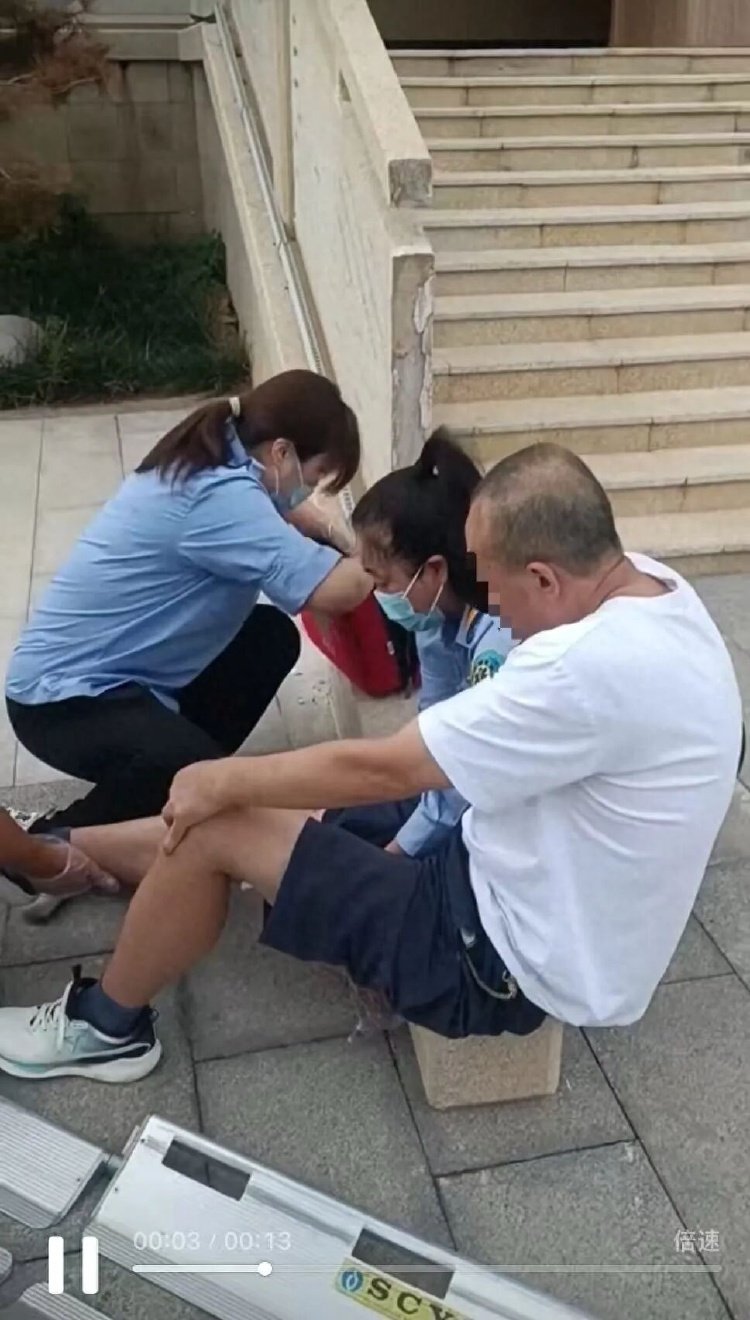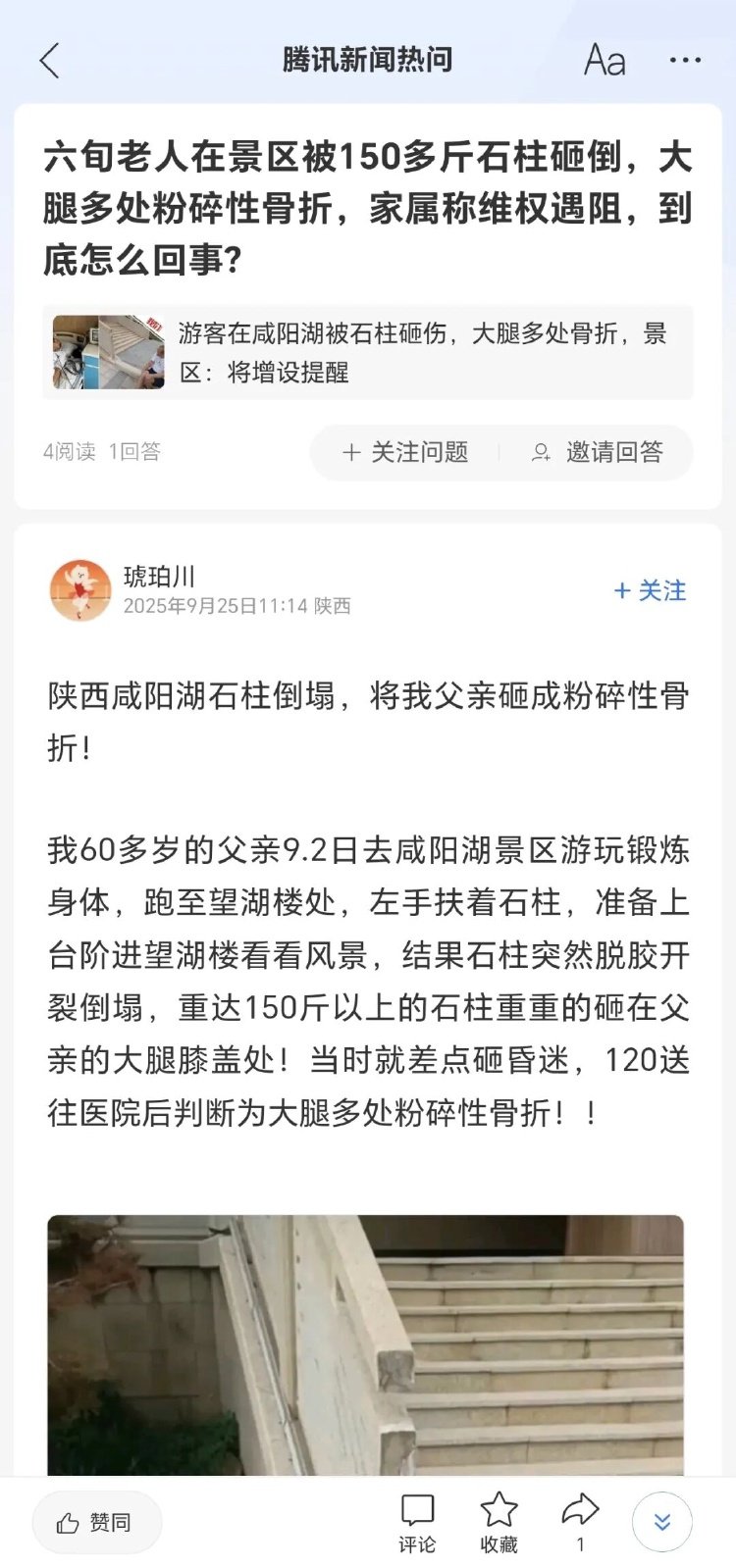 李女士介绍,9月2日早上,其父亲到咸阳湖景区遛弯,走到景区内的望湖楼,左手扶着石柱的护栏,右腿准备上台阶的时候,石柱突然断裂倒塌,砸到了他的大腿。