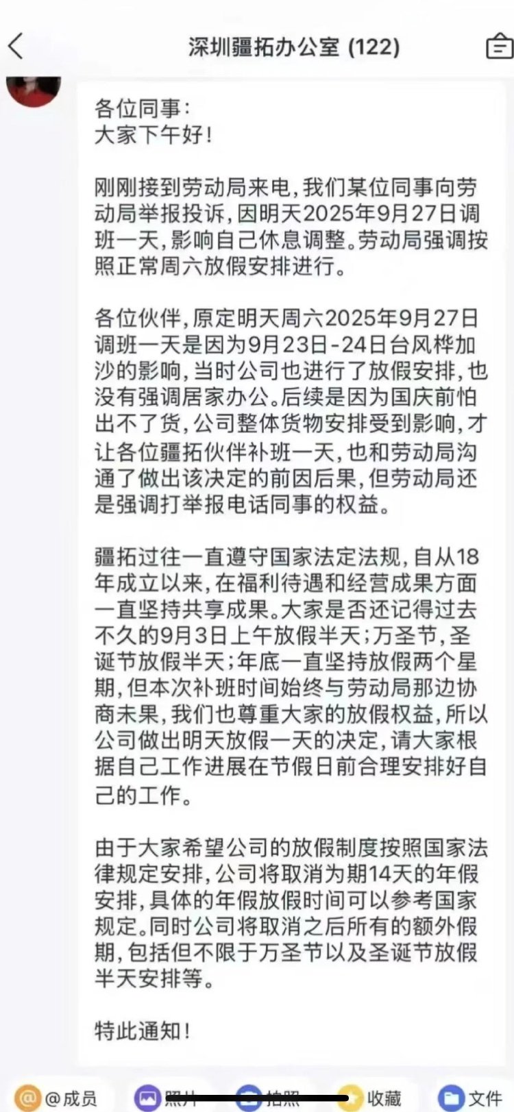 极目新闻消息,9月27日,深圳市一公司因此前台风放假耽误了工期,要求员工在27日(周六)当天补班一天,结果被员工投诉至劳动部门。当天该公司发布通知,满足员工要求,27日不调班,但将调整公司放假制度,取消员工14天年假福利及所有额外假期。此事引发网友讨论。