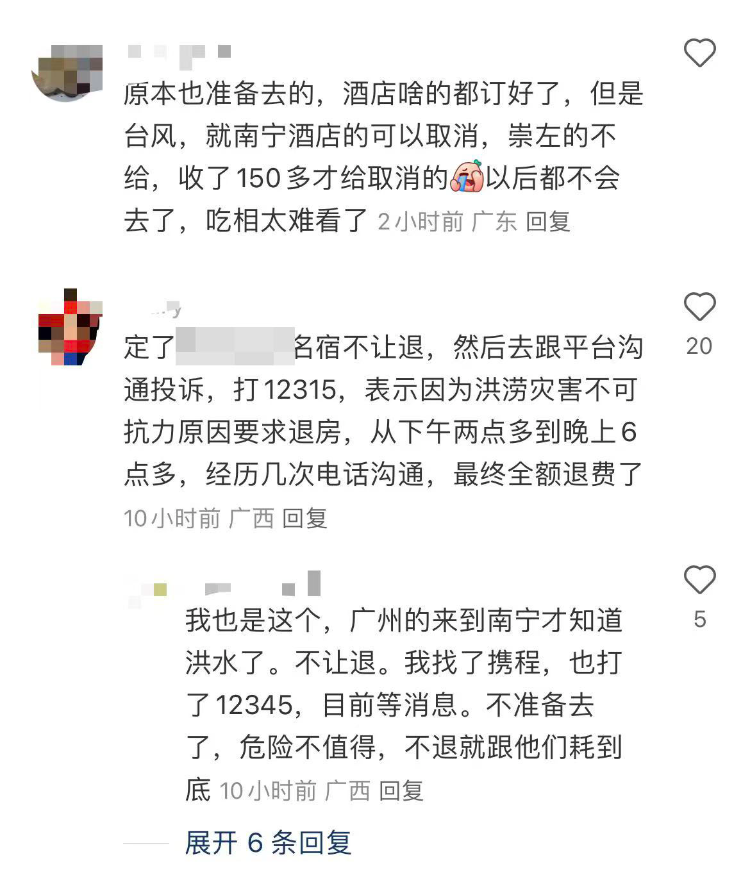 北女士认为,洪涝灾害属于不可抗力,消费者有权利获得全部退费。她昨天打了一晚上的投诉电话,截至发稿前,北女士向记者确认,发呆坡民宿已全额退款,但崇左另一家酒店收取了10%的违约金。“我还预付了拍摄写真的定金,现在定金也打了水漂。”北女士无奈表示,天气严重影响了广西行,她做了半个月攻略等于没做。她称,自己原本计划1号游玩南宁,2号抵达崇左,但目前已改签机票,决定前往桂林。
