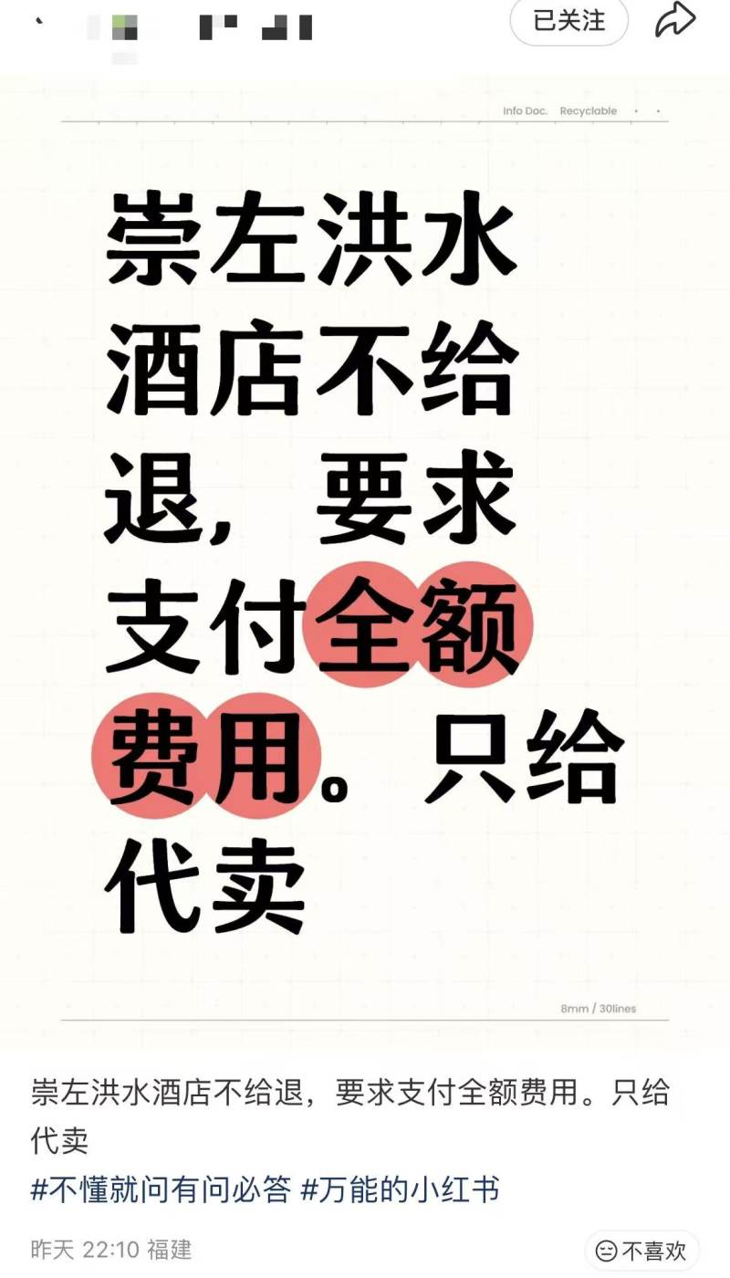 有网友在社交平台上发帖称崇左的酒店不能全额退款。网络截图