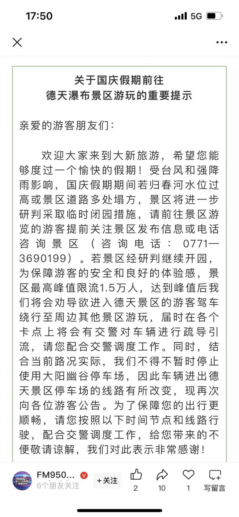 崇左市德天瀑布景区发布游玩提示。网络截图