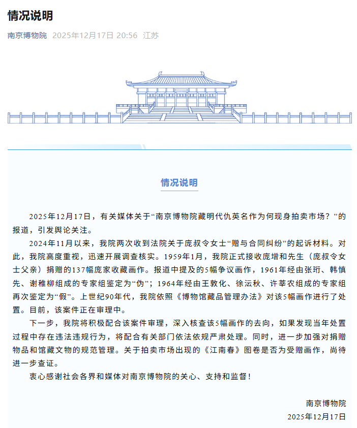 12月17日,南京博物院发布情况说明:2025年12月17日,有关媒体关于“南京博物院藏明代仇英名作为何现身拍卖市场?”的报道,引发舆论关注。