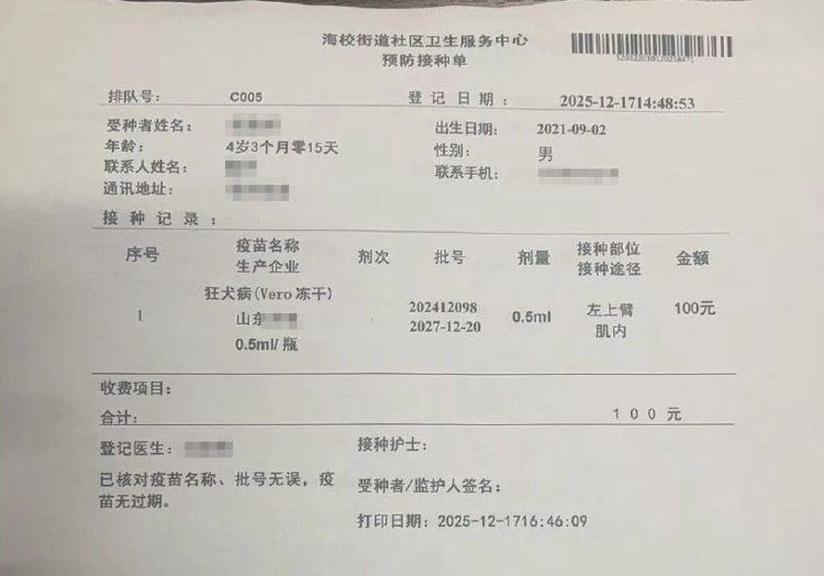 据介绍,12月17日下午1时许,陈女士的儿子不慎被狗咬伤,随后孩子由家中老人带到该卫生服务中心接种疫苗。