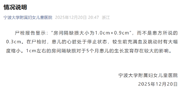 12月20日,宁波大学附属妇女儿童医院发布情况说明,称尸检报告显示:“房间隔缺损大小为1.0cm×0.9cm”,而不是患方所说的0.3cm。在尸检时,患儿的心脏处于停止状态,较生前充满血及跳动时有大幅度缩小。1cm左右的房间隔缺损对于5个月患儿的生长发育存在较大的影响。