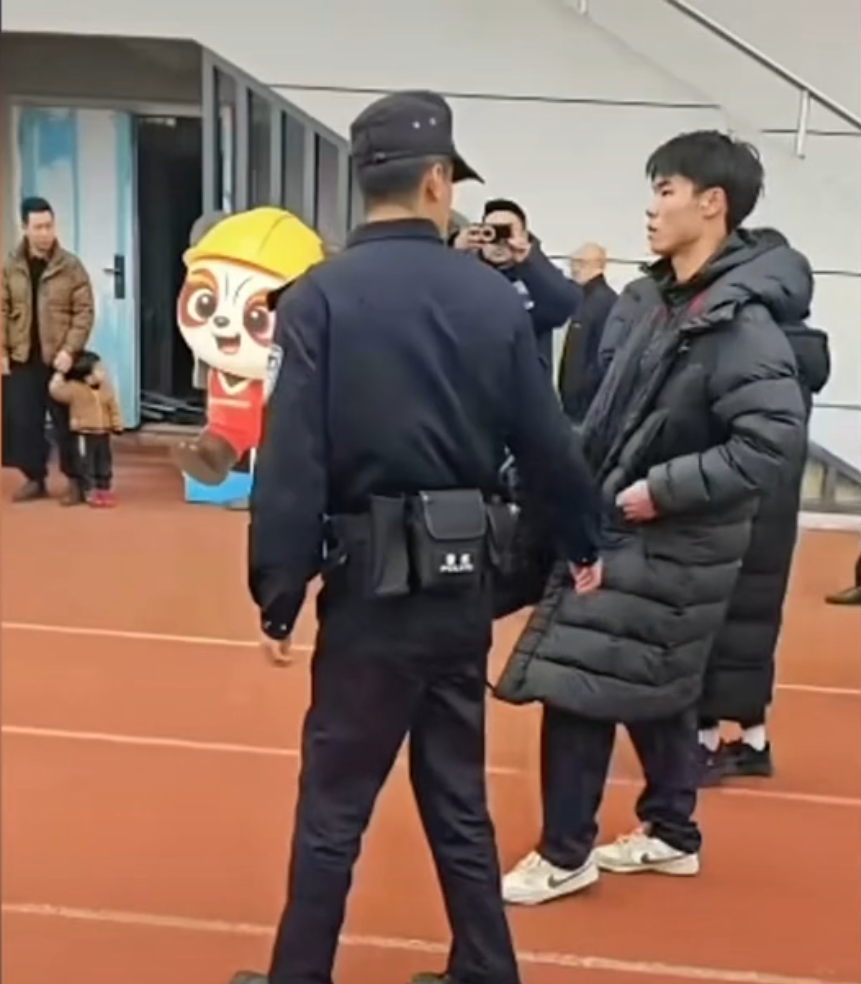 宜宾球员何俊杰被警方带走。视频截图