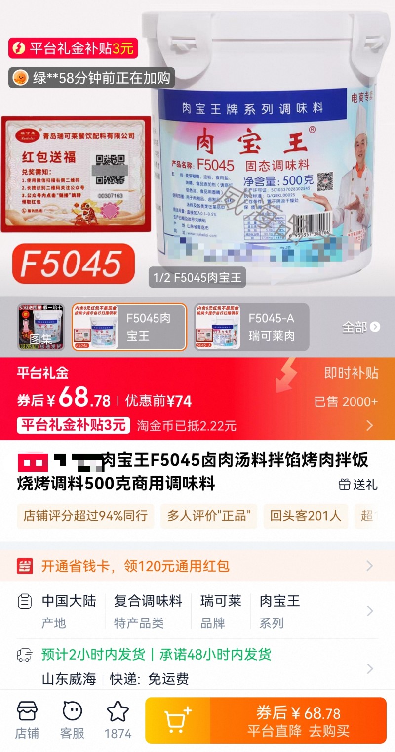 记者按照小陈视频中的信息,查到了小陈所用的“肉宝王”是由青岛一家调味品工厂生产的“F5045固态调味料”,主要成分为麦芽糊精、淀粉、食用盐、味精、食品添加剂(惑红铝色淀、食品用香精)。“肉宝王”在主要的电商平台都有售,属于复合调味料,可用于卤肉、汤料、拌馅、烤肉、烧烤调料等用途。