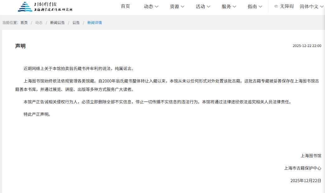 12月22日晚,上海图书馆网站发布声明,全文如下: