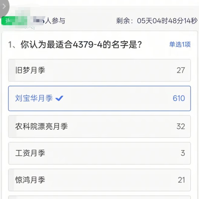 近日,云南省农科院开启了一项为新品种月季4379-4征名的活动,山东的康先生(网名:有之)发了个略带调侃的建议:“刘宝华月季,因为我二舅叫刘宝华。”没想到这条评论有超过1.5万名网友点赞,此后的投票中“刘宝华月季”真的被投到了“榜一”。随后,云南省农科院采纳了康先生的建议,给这种月季起名为“宝华月季”,并进行了网上申报。