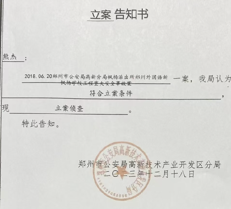 2023年12月18日,郑州市公安局高新分局以工程重大安全事故案立案侦查。受访者供图