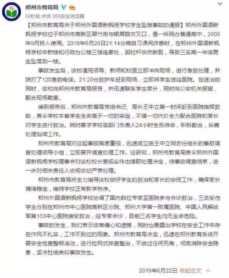 2018年6月20日,晚自习课间休息时,郑州外国语新枫杨学校(以下简称“新枫杨学校”)中教楼和行政办公楼三楼连廊处的栏杆突然断裂,三名高一年级男生坠落到一楼。当晚,三人被送医抢救。