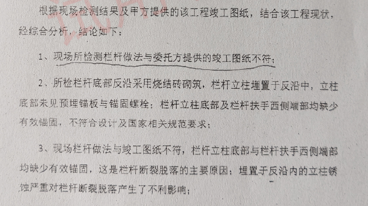 熊杰提供给新京报记者的一份鉴定报告显示,断裂的栏杆并未按照竣工图纸施工,不符合国家相关规范要求。他认为,施工、监理、校方等单位的主要责任人员都应对此担责。
