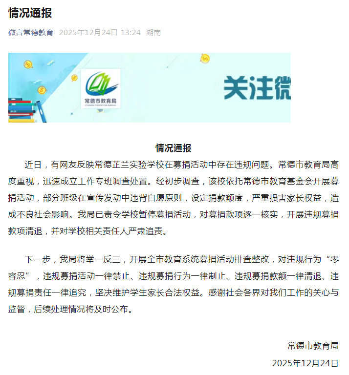 近日,有网友反映常德芷兰实验学校在募捐活动中存在违规问题。常德市教育局高度重视,迅速成立工作专班调查处置。经初步调查,该校依托常德市教育基金会开展募捐活动,部分班级在宣传发动中违背自愿原则,设定捐款额度,严重损害家长权益,造成不良社会影响。我局已责令学校暂停募捐活动,对募捐款项逐一核实,开展违规募捐款项清退,并对学校相关责任人严肃追责。