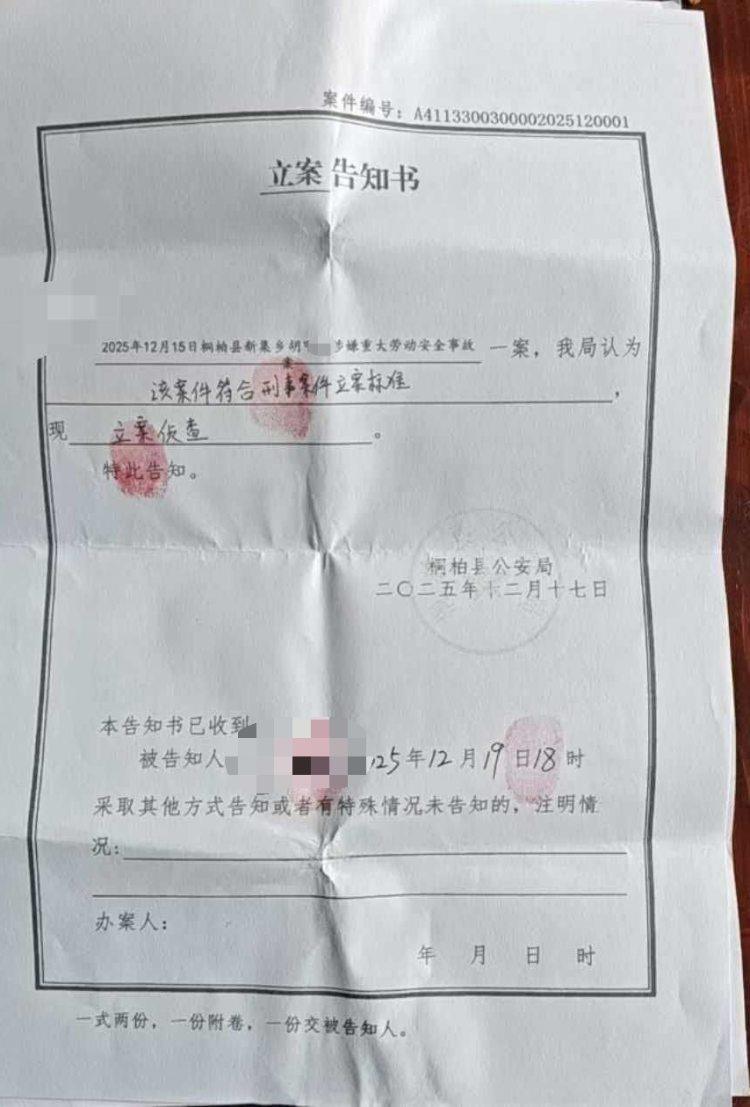 12月17日,魏某某家属收到了桐柏县公安局立案告知书。告知书上载明:12月15日桐柏县新集乡胡某某涉嫌重大劳动安全事故一案,我局认为该案件符合刑事案件立案标准,现立案侦查。