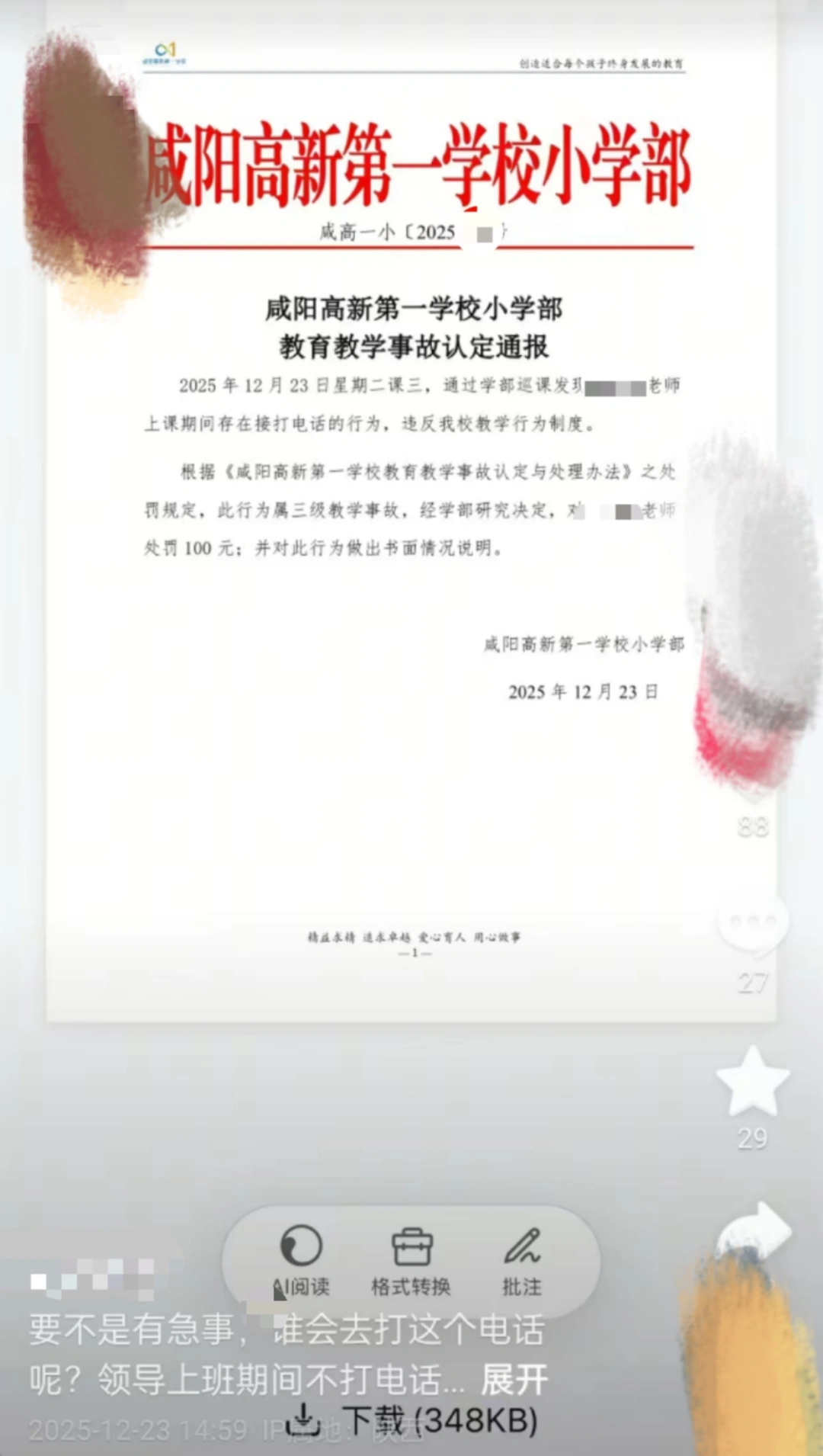涉事学校是咸阳高新第一学校,是一所公办学校。视频为该校小学部一则通报文件:23日课三,学部巡查发现这位老师上课期间存在接打电话行为。根据该校规定,此行为属三级教学事故,决定对其处罚100元;并对此行为作书面情况说明。