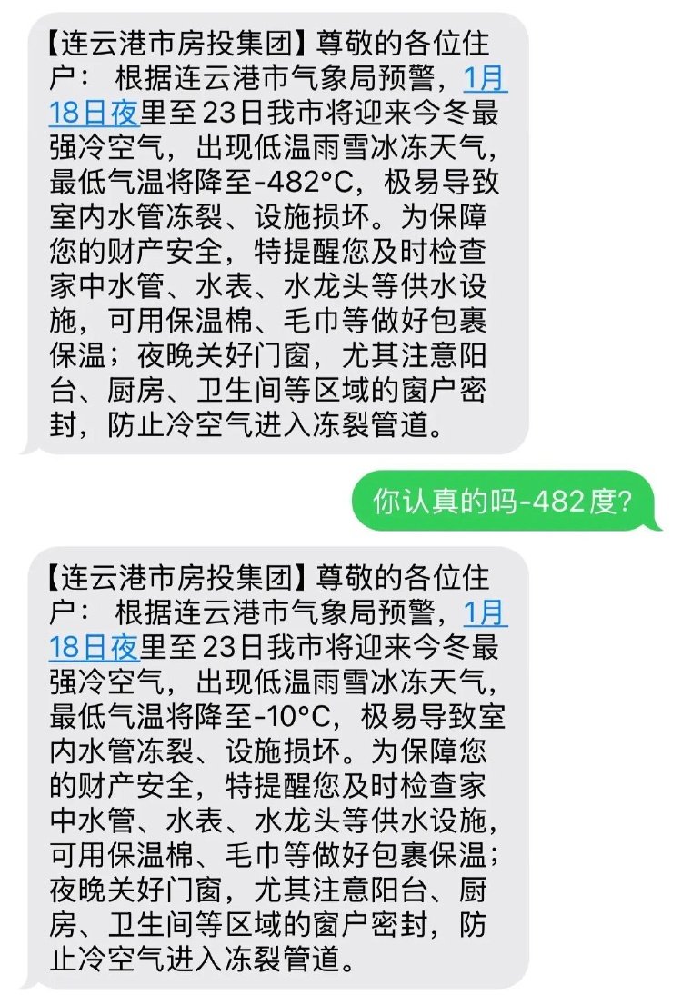 原标题:连云港网友收到“﹣482℃”降温预警短信,工作人员致歉:存在失误,已发更正短信