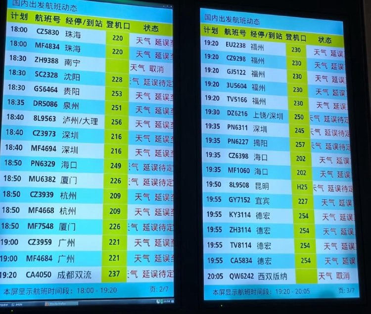 网友发布的当晚的郑州机场“出发信息”显示屏中,当天18时至20时时段,所有航班都因“天气延误待定”或因“天气取消”。