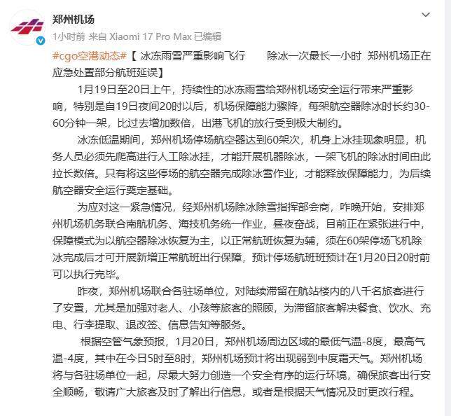 该消息称,机场需在60架停场飞机除冰完成后才可开展新增正常航班出行保障,预计停场航班在1月20日20时前执行完毕。