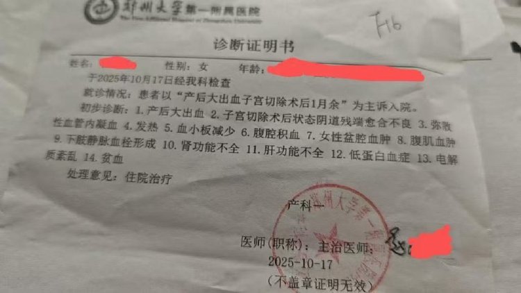澎湃新闻获取的郑大一附院2025年10月17日诊断证明显示,乔乔的病症包括产后大出血、子宫切除术后状态伴阴道残端愈合不良、弥散性血管内凝血等,共计14项。