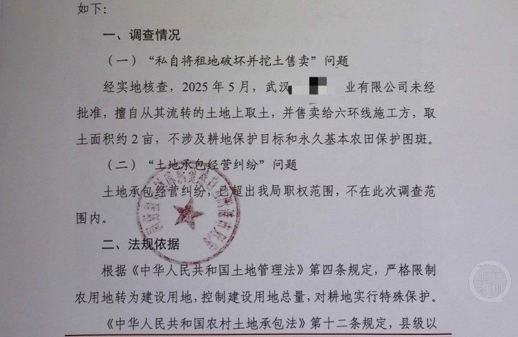 由涉事村民提供的武汉新洲区自然资源和城乡建设局《行政履职程序答复书》显示,经实地核查,2025年5月,武汉一肥业公司未经批准,擅自从其流转的土地上取土,并售卖给六环线施工方,取土面积约2亩,“不涉及耕地保护目标和永久基本农田保护图斑”。(同年)11月13日,该局联合李集街综合执法中心工作人员,对肥业公司负责人进行当面约谈,明确提出警告,同时详细宣讲了土地管理相关法律法规及政策要求,督促其严格遵守土地用途管制规定,杜绝违法违规行为。