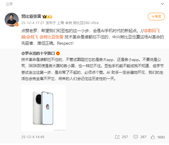 中兴通讯副总裁、努比亚旗舰产品总经理张雷转发罗永浩微博表示,希望这是AI手机时代的新起点。