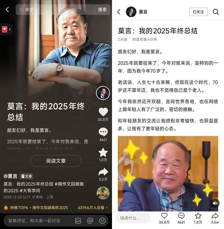 作家莫言日前在抖音发布2025年终总结文章,体验了长图文功能。