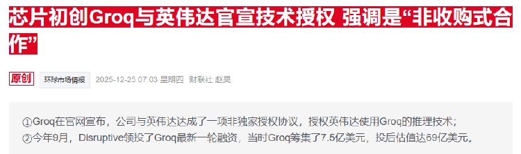 财联社消息,两天前,芯片初创公司Groq宣布已与英伟达就其推理技术“达成非独家许可协议”,扭转了“英伟达斥资200亿美元收购Groq”这一传闻。