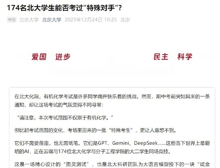 它们不需要落座,也无需纸笔。它们是GPT、Gemini、DeepSeek……这些当下世界上最聪明的AI,正在云端与174位北大化学与分子工程学院的大二学生同场竞技。