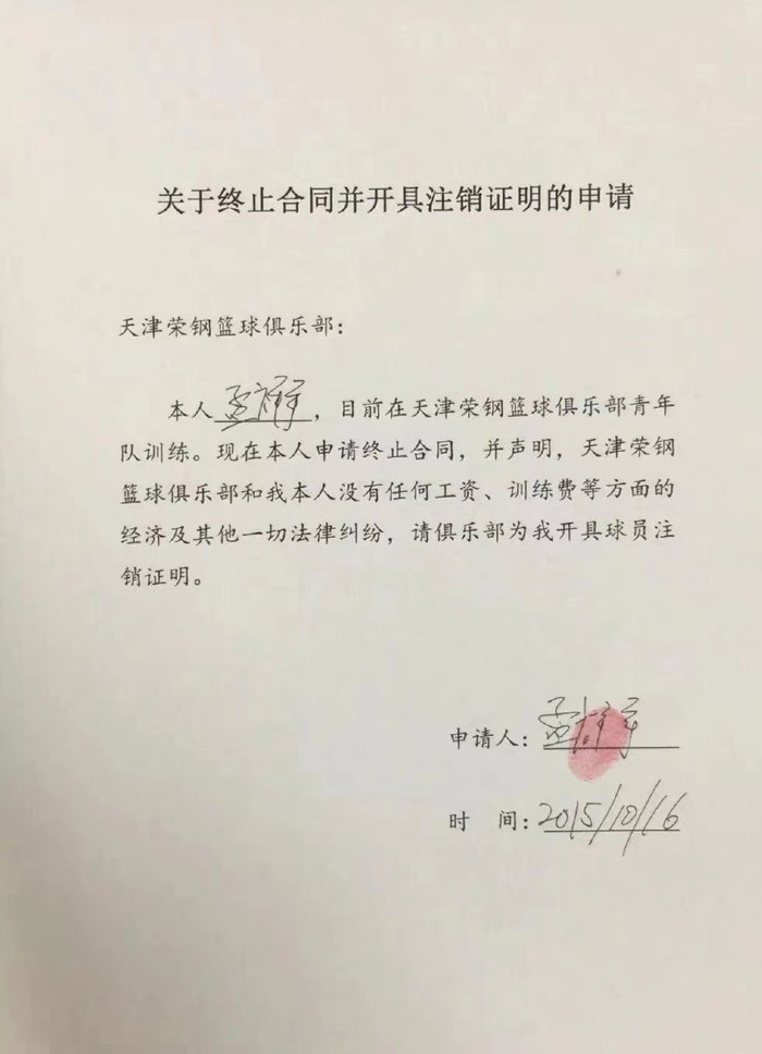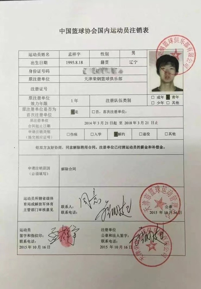 1、孟祥宇2014年3月加入天津荣钢篮球俱乐部,2015年10月经其本人申请终止合同,其本人声明天津荣钢篮球俱乐部和其本人没有任何工资、训练费等方面的经济及其他一切法律纠纷。