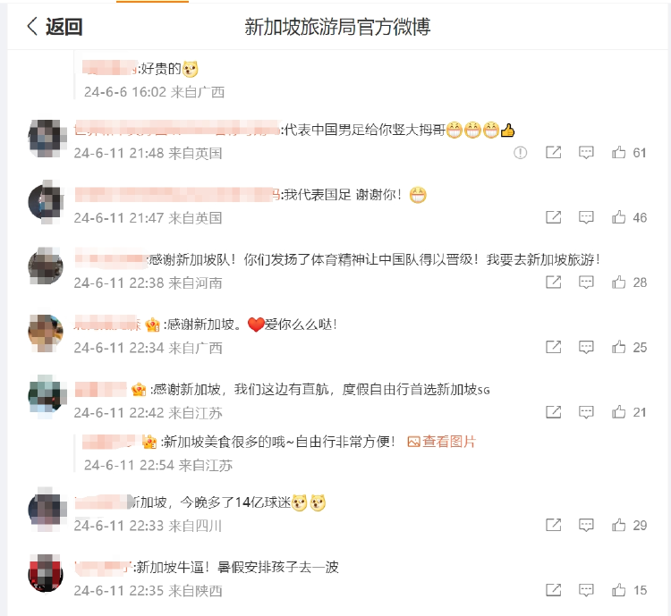 此外,新加坡旅游局官方微博评论区也被中国球迷刷屏:“代表中国男足给你竖大拇哥”“我代表国足 谢谢你”“新加坡,今晚多了14亿球迷”......