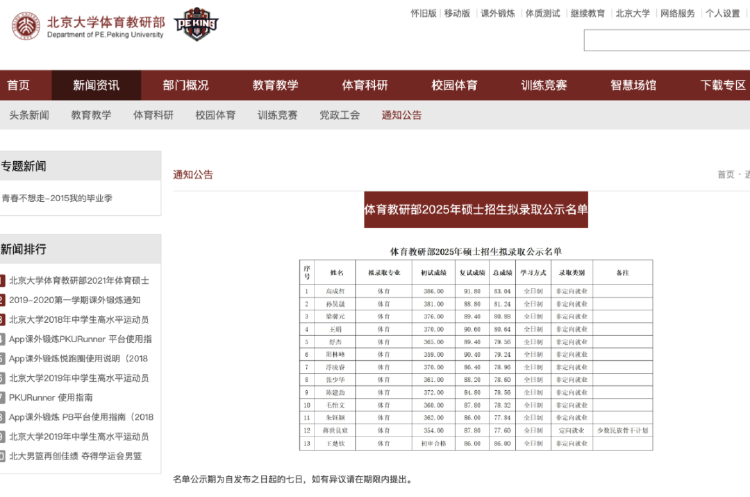 北京大学体育教研部2025年硕士招生拟录取公示名单