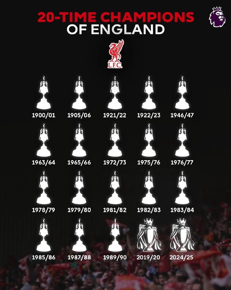原标题:利物浦提前四轮英超夺冠 顶级联赛冠军数追平曼联