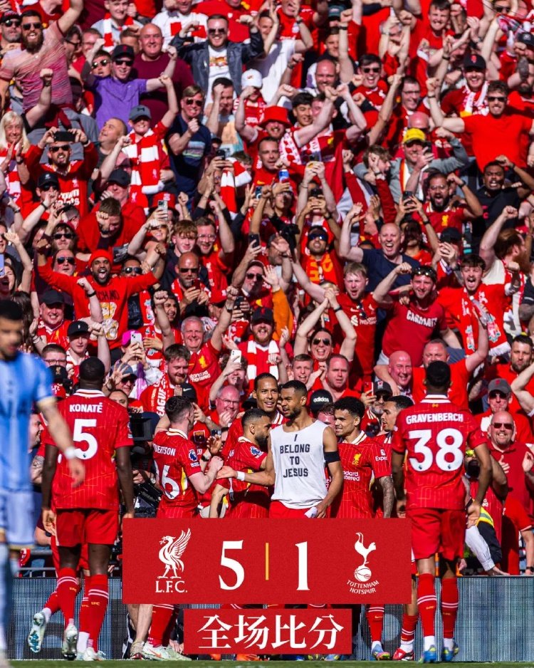 进入下半场,主队攻势不减。萨拉赫第63分钟在反击中完成破门,随后又制造乌多吉乌龙,全场比分被定格在5:1。终场结束前,主队球迷高唱队歌《你永不独行》(You'll Never Walk Alone),共同迎接属于球队的第二座英超冠军奖杯。