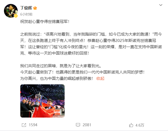 之前我说过:“很高兴地看到,当年我踏碎的门槛,如今已成为大家的跑道!”而今天,在这条跑道上终于有人冲到终点!恭喜赵心童夺得2025年斯诺克世锦赛冠军!这让曾经的“门槛”化成今夜的星光!这一刻的荣耀,是对一直在支持中国斯诺克、等待这一天的中国球迷最好的回报!