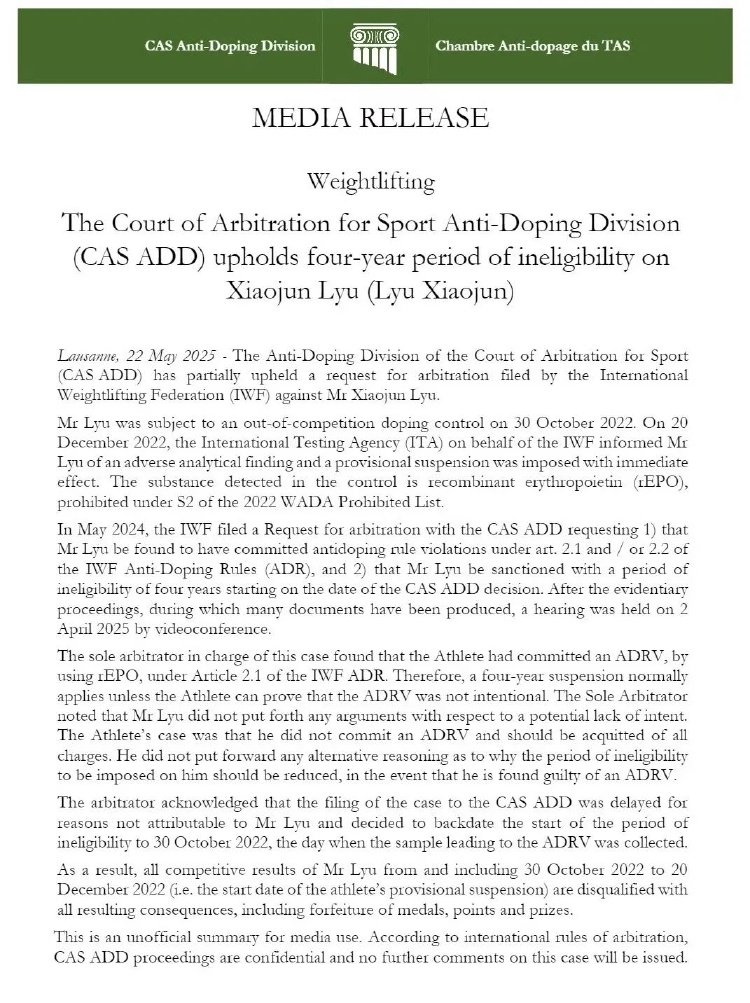 2024年5月,国际举重联合会向国际体育仲裁院反兴奋剂部门提起仲裁,请求认定吕小军违反《国际举联反兴奋剂规则》等相关条例,并处以自裁决之日起四年的禁赛处罚。