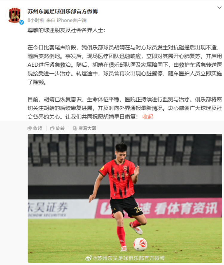 8月10日,在中甲联赛第20轮苏州东吴主场对阵石家庄功夫的比赛中,苏州东吴球员胡靖在无征兆的情况下突然倒地晕厥,当场被抬上救护车紧急送医,相关消息引发各方关注。