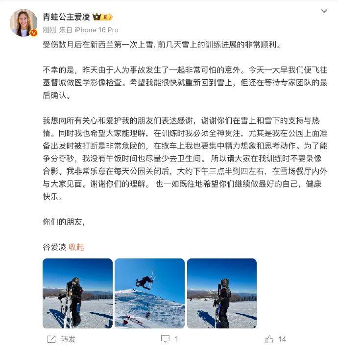 8月16日,谷爱凌发文谈到在新西兰训练时发生意外,正在进行医学影像检查,并请大家在自己训练时不要录像合影。