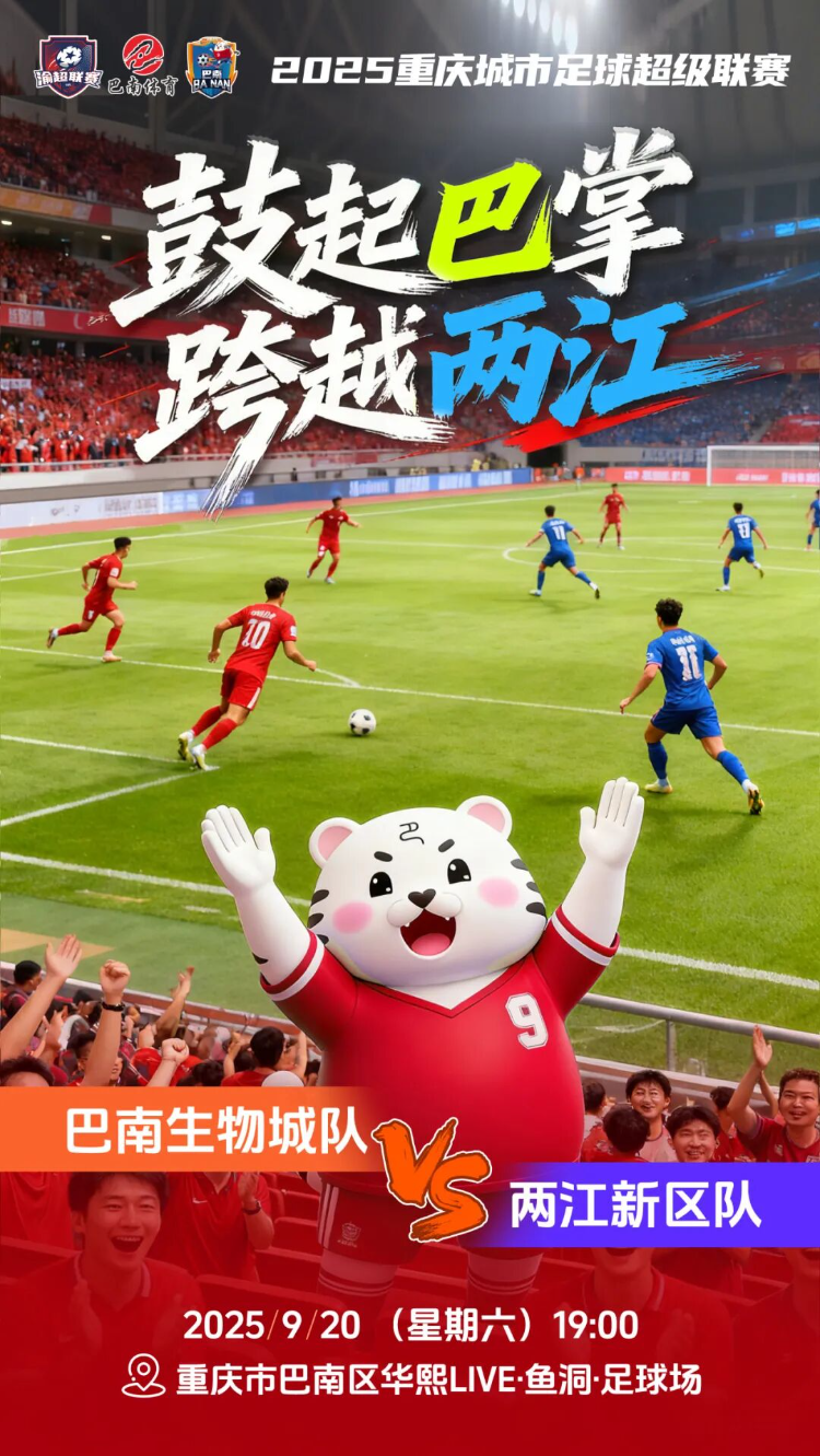 今晚(20日)在中心城区举行的巴南生物城队VS两江新区队,同样不乏趣味造梗、战前放狠话,有海报比拼,也有口号对决。比如巴南队的海报“举起‘巴’掌,跨越‘两江’”,还有官方媒体发布的“两江别摆谱,脚法我最虎!”“主场我做主,进球挡不住!”两江新区队也有不少回应:“两江踢巴南,一点都不难”“两江两江,踢得巴南抓不到疆!”