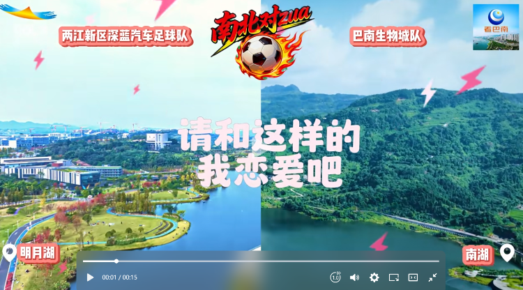 上游新闻还发现一个有趣现象,部分文旅在推荐自身特色旅游资源时,把赛场上的对手也带上,一起搞起“文旅融合”。比如两江新区官方账号发布了一条旅游资源推荐视频,主题是“请和这样的我恋爱吧”,在推荐自身旅游资源(两江影视城、照母山森林公园等)的同时,也同框推出巴南区旅游景点(丰盛古镇、龙洲湾主题公园等)。