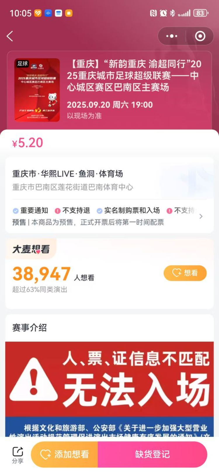 网红城市荣昌当地宣布,“渝超”荣昌主场门票实行免费预约制,球迷通过“荣E游小程序”免费预订、一人一票,门票早早预约一空。